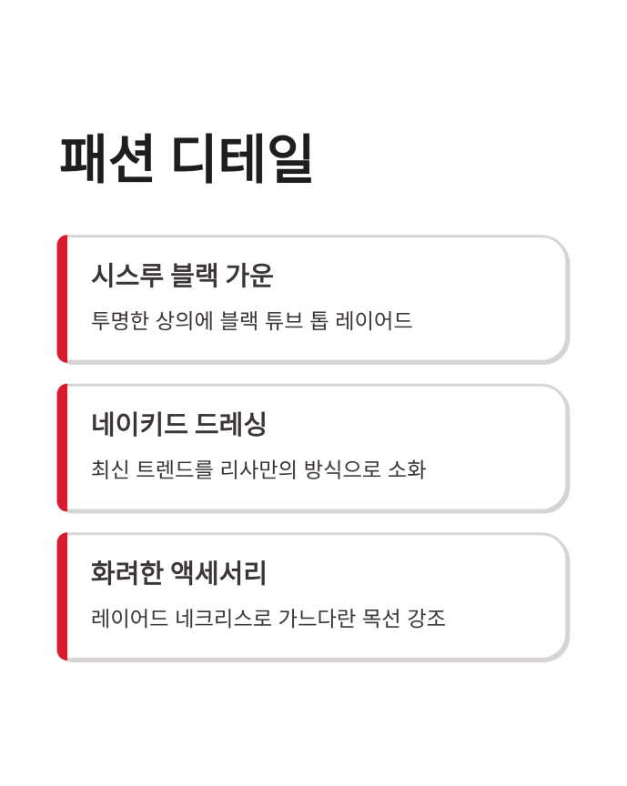 시상식의 꽃은 역시 레드카펫이죠! 리사는 이날 패션계의 뜨거운 감자로 떠올랐습니다. 리사가 선택한 의상은 바로 자크뮈스(Jacquemus)의 시스루 블랙 가운이었는데요, 우아함과 고혹적인 매력을 동시에 잡았다는 찬사가 쏟아지고 있어요. 투명한 상의 안에 블랙 튜브 톱을 레이어드한 이 드레스는 최근 유행하는 '네이키드 드레싱' 트렌드를 리사만의 방식으로 아주 세련되게 소화했다는 평을 받고 있습니다.