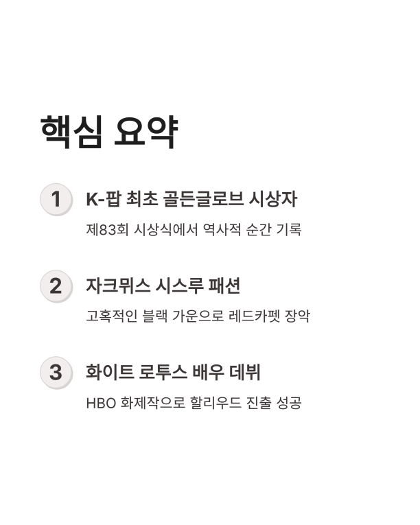 - 최초의 기록: K-팝 스타 최초로 제83회 골든글로브 시상자로 참석