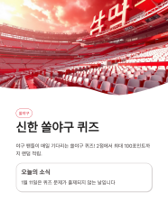 야구 팬분들이 매일 기다리시는 신한 SOL뱅크의 쏠야구 퀴즈 소식도 전해드려야겠죠? 안타깝게도 오늘은 쏠퀴즈 문제가 따로 출제되지 않는 날이라고 합니다. 가끔 야구 시즌이나 운영 정책에 따라 퀴즈가 쉬어가는 날이 있는데 오늘이 바로 그날이네요. 쏠야구 퀴즈는 보통 2점에서 최대 100포인트까지 랜덤으로 적립해 줘서 인기가 참 많은데, 오늘은 아쉬운 대로 다른 퀴즈들에 집중해야 할 것 같아요.